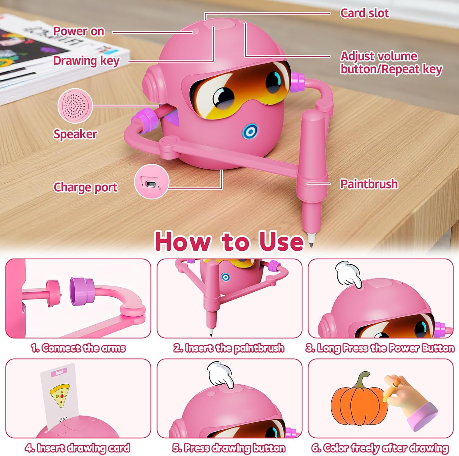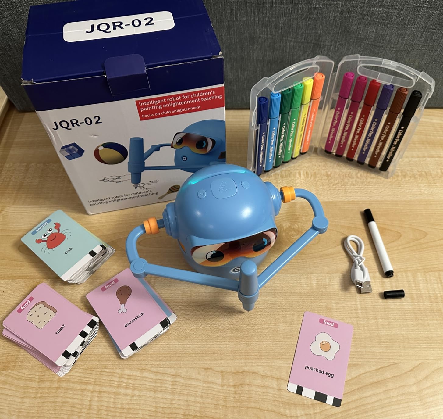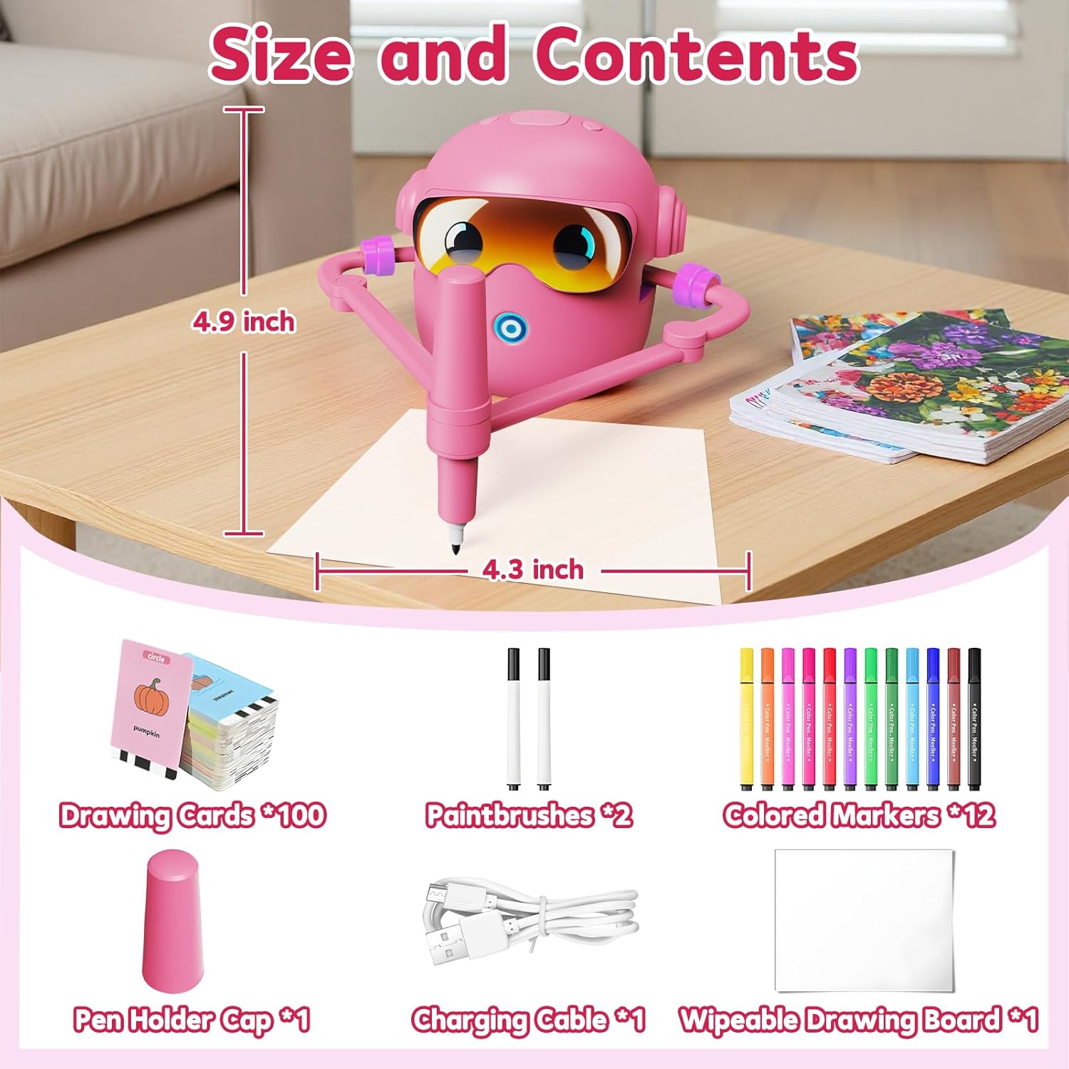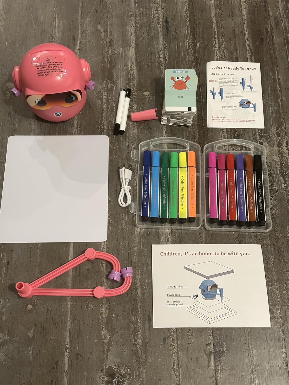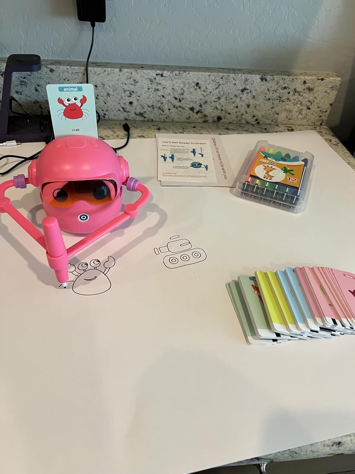 You get everything needed to start drawing immediately: The Artiebot robot, 100 step-by-step flash cards, 2 drawing makers (pens), a handy little whiteboard, and a set of 12 colorful markers.